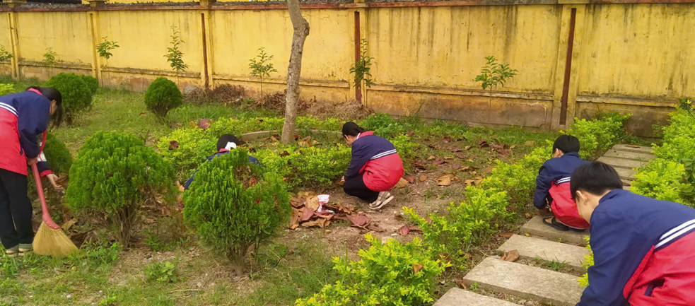 Sự gắn kết tập thể được thể hiện rõ nét qua từng cử chỉ phối hợp nhịp nhàng giữa các nhóm học sinh. Không cần sự nhắc nhở trực tiếp từ thầy cô. Không ai bảo ai, mỗi người một việc: bạn quét rác, bạn thu gom lá khô, bạn bê xô rác… Tiếng cười đùa hồn nhiên giòn giã xen lẫn tiếng trò chuyện râm ran, tiếng chổi tre xào xạc vang vọng khắp không gian, hòa cùng sự hăng say lao động tạo nên một bức tranh thanh xuân tươi đẹp dưới mái trường Trực Chính.